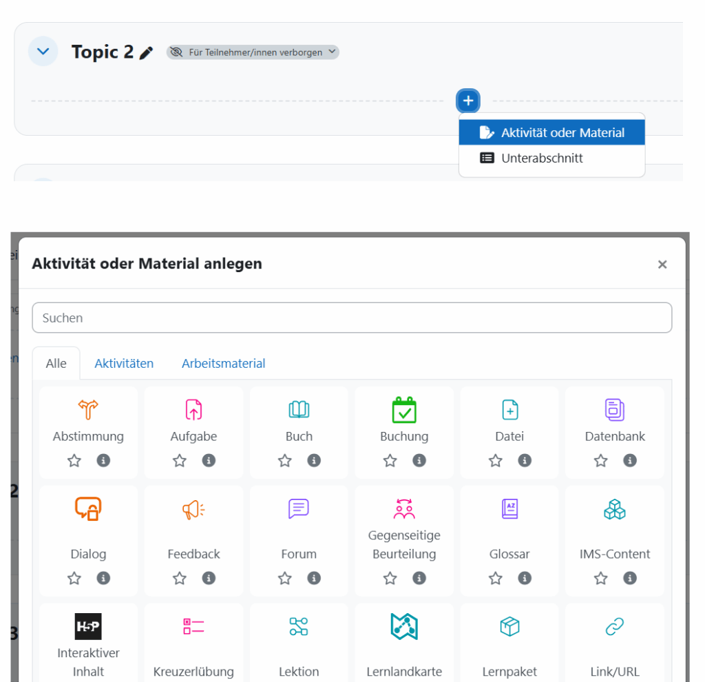 Um Dateien hochzuladen, klicken Sie im gewünschten Themenabschnitt im Kurs auf das + Zeichen am unteren Rad des Abschnitts und wählen Sie Material oder Aktivität anlegen. Wählen Sie im Pop-Up-Fenster das Arbeitsmaterial Datei aus. Bestätigen Sie Ihre Eingabe, indem Sie auf den Button Hinzufügen klicken.