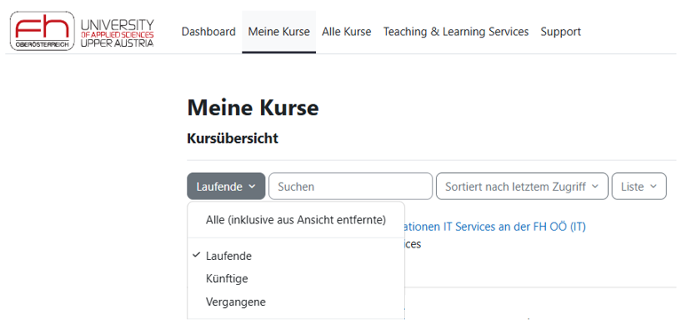 Nach dem Login gelangen Sie direkt zum Dashboard. Über die verschiedenen Reiter erhalten Sie Zugriff auf unterschiedliche Services und Funktionen. Im Bereich „Kurse“ finden Sie eine Übersicht Ihrer Lehrveranstaltungen. Dort stehen Ihnen Dropdown-Einstellungen zur Verfügung, die Sie individuell nach Ihren Bedürfnissen anpassen können.
