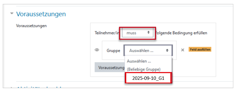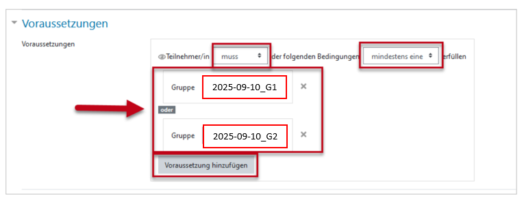 Den Test können Sie wie folgt unter den Voraussetzungen auf bestimmte Gruppen einschränken: wählen Sie unter „Voraussetzungen“ den Punkt „Voraussetzung hinzufügen“ und gehen auf den Punkt „Gruppe“.