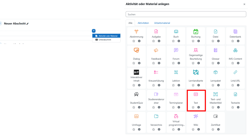2. Wählen Sie einen Abschnitt aus und mit dem Button + Aktivität oder Material anlegen fügen Sie den Test hinzu.