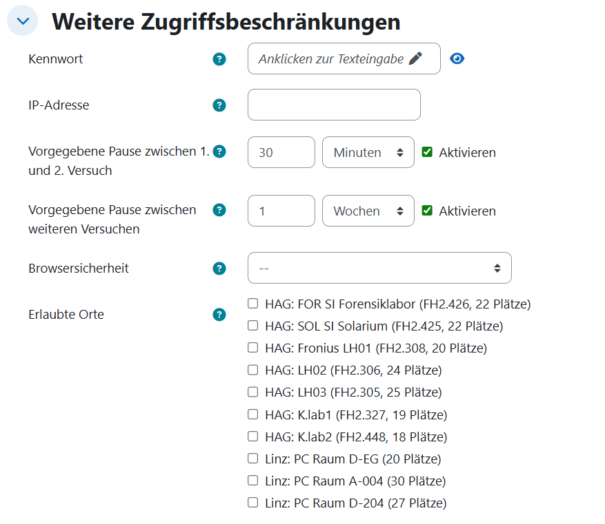Erlaubte Orte: nur für Prüfungen AM CAMPUS – hier können die jeweiligen Labore/EDV-Räume/PC-Räume als Prüfungsorte eingestellt werden. Somit ist die Prüfung dann nur in den gewählten EDV/PC-Raüm durchführbar. Für Prüfungen, die AUSSERHALB des Campus (Prüfungen zuhause – @home) durchgeführt werden, dürfen hier KEINE Einstellungen getätigt werden. Für Prüfungen zuhause – @home folgen wir den Protokollen von Proctor Constructor.