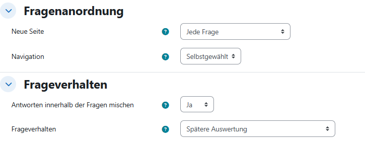 Die Option „Vorgegeben“ legt die Navigationsreihenfolge fest – sie verhindert, dass Studierende zwischen den einzelnen Fragen wechseln können. Diese Option NICHT empfohlen.
