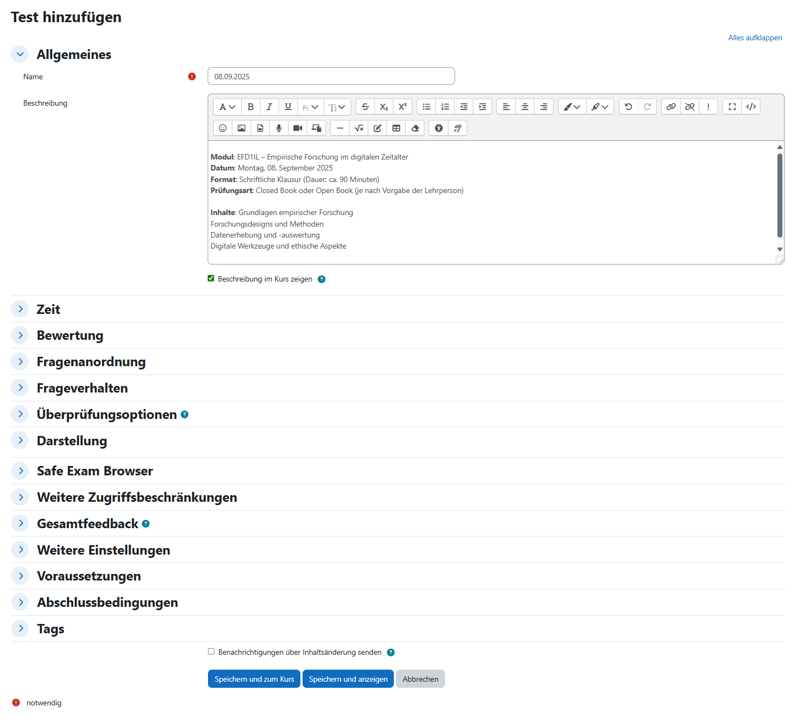 Nachdem Sie einen neuen Test hinzugefügt haben, öffnet sich nun der erste Bereich des Test-Einstellungen. Hier beginnen Sie unter Punkt Allgemeines mit der Benennung des Tests im Textfeld unter Name (z. B. Klausur 08.09.2025). Alternativ können Sie auch eine Beschreibung hinzufügen.