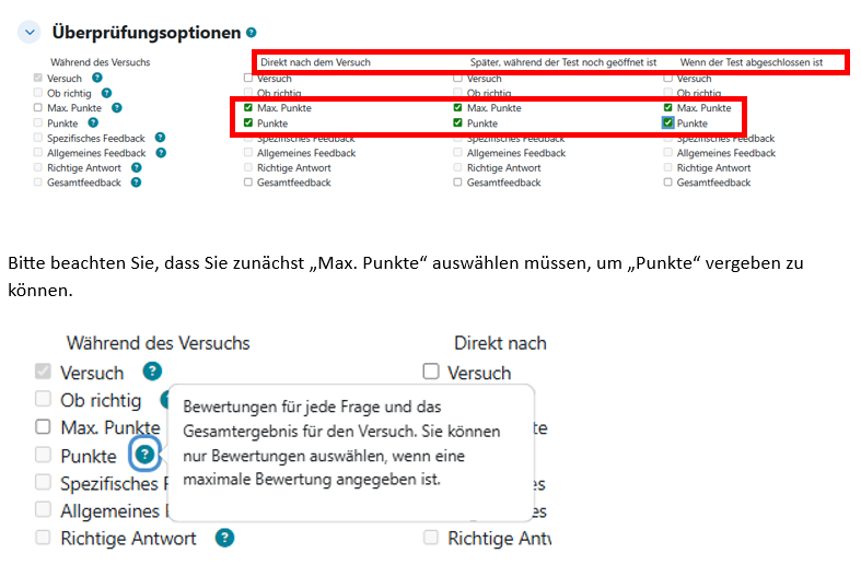 Alternativ kann die Option „Punkte“ bei den Überprüfungsoptionen „Direkt nach dem Versuch“, „Später, während der Test noch geöffnet ist“ und „Wenn der Test abgeschlossen ist“ aktiviert werden. Dadurch sehen die Studierenden unmittelbar nach dem Test ihre erreichten Punkte.
